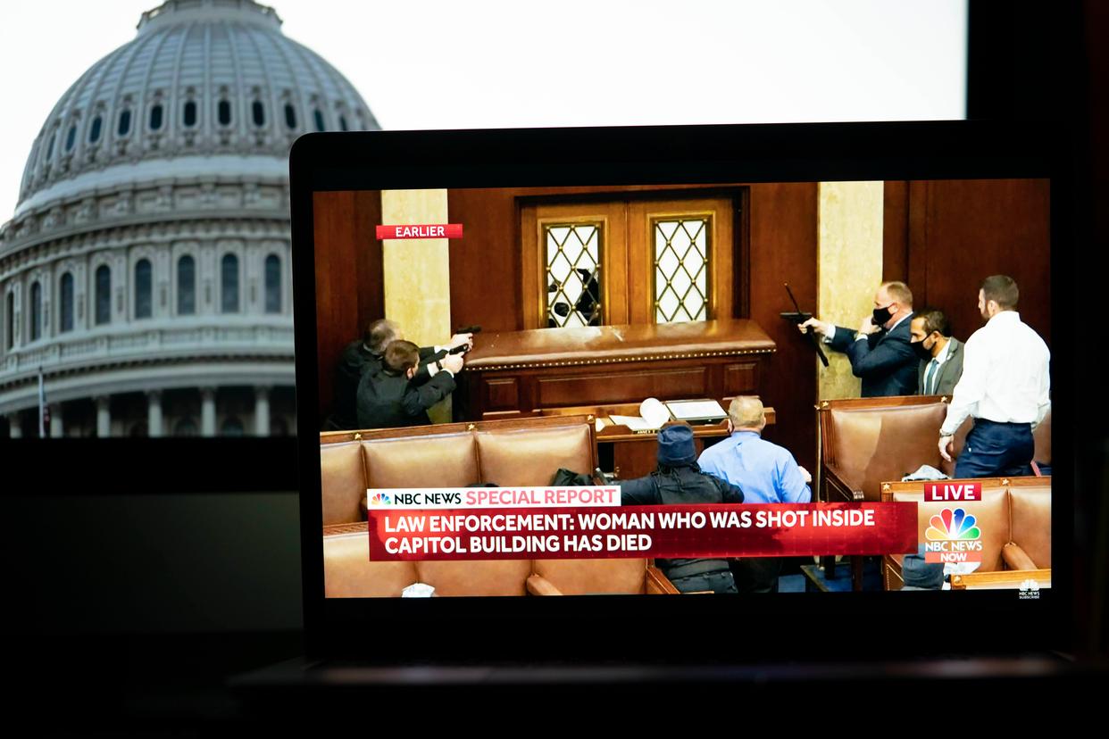 2021年1月6日拍摄的电视画面显示,美国华盛顿国会大厦内的工作人员应对闯入者。新华社记者刘杰摄