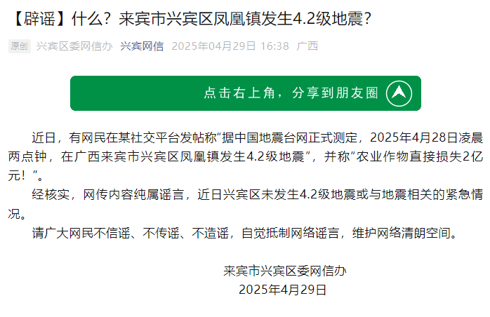 近日,有网民在某社交平台发帖称“据中国地震台网正式测定,2025年4月28日凌晨两点钟,在广西来宾市兴宾区凤凰镇发生4.2级地震”,并称“农业作物直接损失2亿元”。