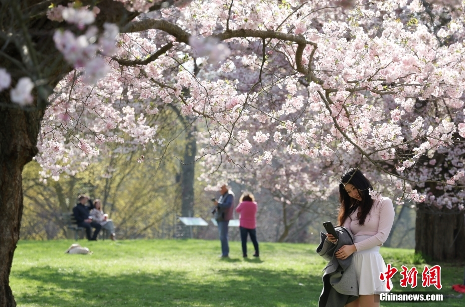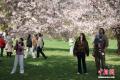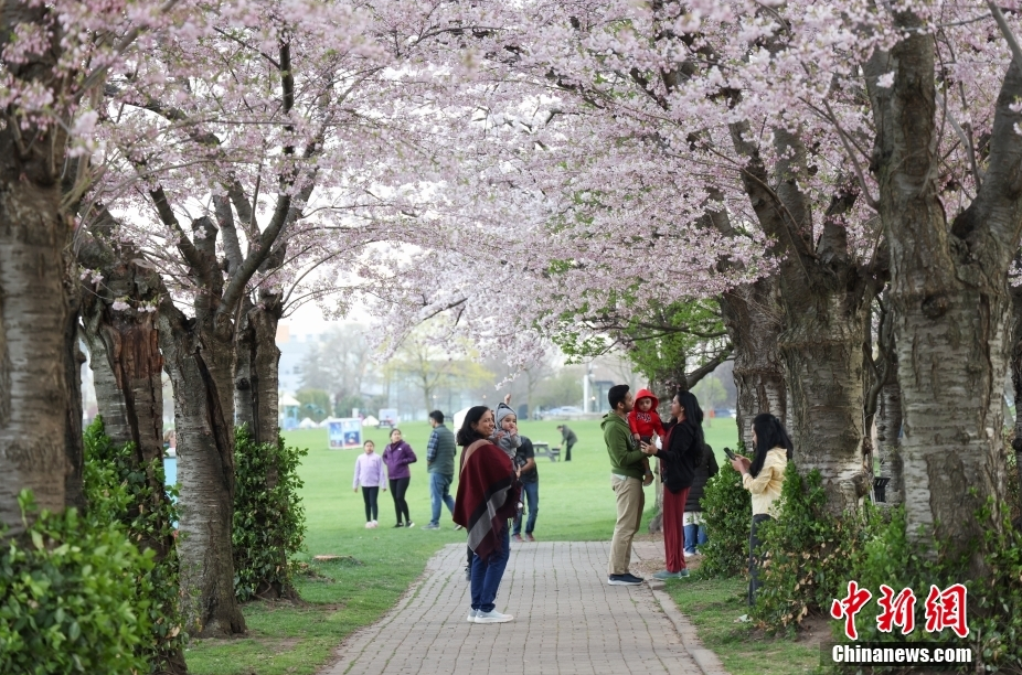 当地时间4月30日,加拿大安大略省宾顿市(Brampton),民众在皇家植物园内的樱花树下驻足、留影。当地及毗邻的大多伦多地区正迎来樱花盛放期。中新社记者 余瑞冬 摄