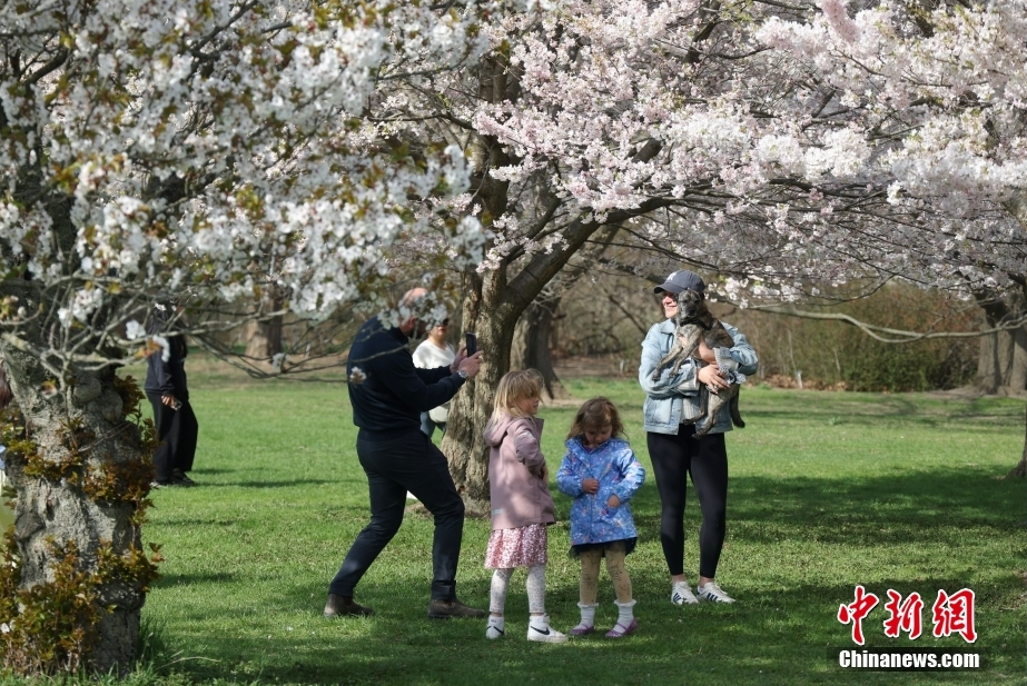当地时间4月30日,加拿大安大略省宾顿市(Brampton),一家大小游客在皇家植物园内的樱树下赏花留影。当地及毗邻的大多伦多地区正迎来樱花盛放期。中新社记者 余瑞冬 摄
