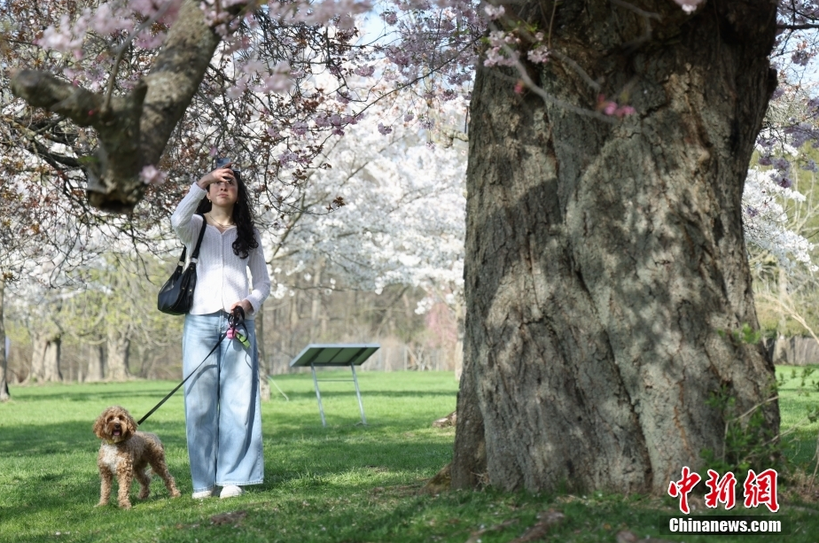 当地时间4月30日,加拿大安大略省宾顿市(Brampton),一位女子带着宠物狗在皇家植物园内拍摄绽放的樱花。当地及毗邻的大多伦多地区正迎来樱花盛放期。中新社记者 余瑞冬 摄