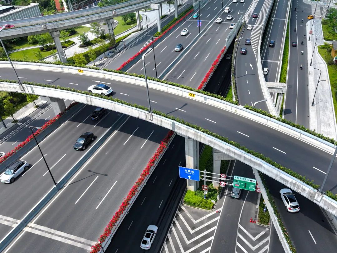 瓯越大道以三角梅为核心,通过精细化植物配置与景观布局,打造了层次丰富、色彩鲜明的道路绿化景观,与高架桥上三角梅如彩带般串联道路,结合亮化提升,造就靓丽的城市风景线。