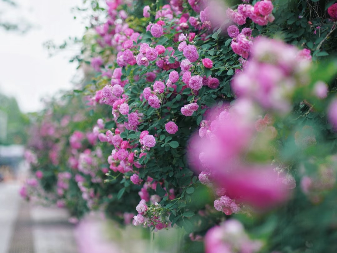 月季正迎来盛开的时期。缤纷多姿的月季随风轻荡,暗香浮动,层层叠叠的娇蕊舒展着曼妙的姿态,为城市街景平添一抹流动的生机。