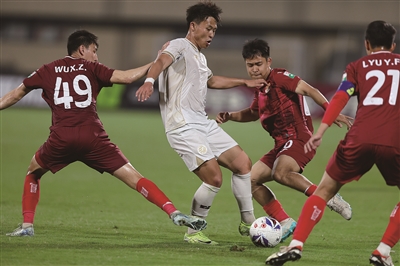 温州职业足球俱乐部中胤队队员(白)带球突围。 苏巧将 摄