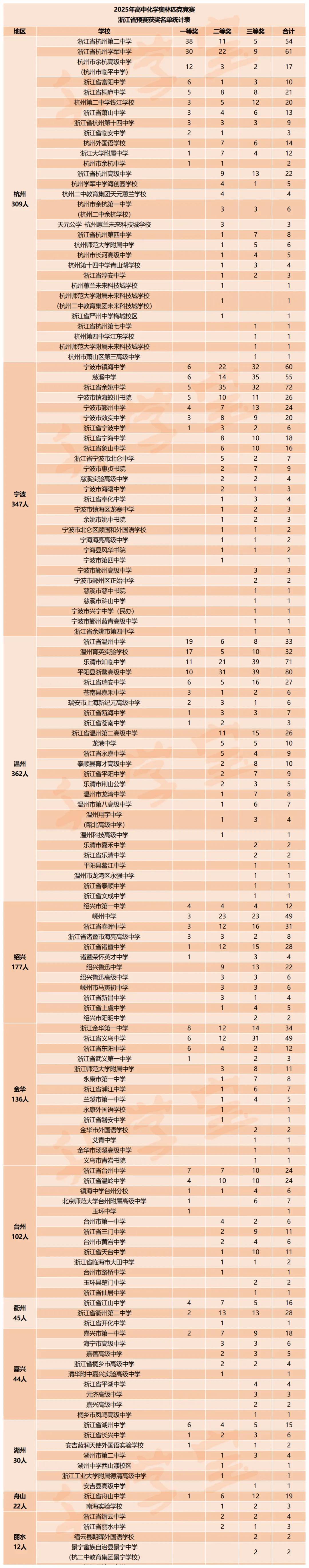 5月2日,浙江省化学会正式公示了《2025年高中化学奥林匹克竞赛浙江省预赛获奖名单》,其中一等奖272人,二等奖537人,三等奖777人。
