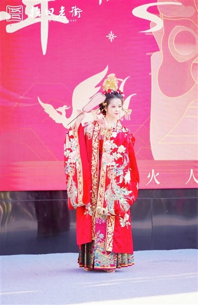 除了学习研究各朝代的历史、服饰文化、妆面、发型、配饰等以外,俞小丹还关注近年来的流行趋势,紧跟热点潮流,将国潮元素与年轻人喜爱的元素和流行影视作品等相结合。如今流行《哪吒之魔童闹海》,俞小丹刚好有个朋友也比较丰满,在她的鼓动下,朋友被她成功打造成“石矶娘娘”。今年三月初十,除了唐风宋韵的水上婚礼、汉服巡游和花朝节活动,这个“石矶娘娘”在舞台亮相,火了一把。