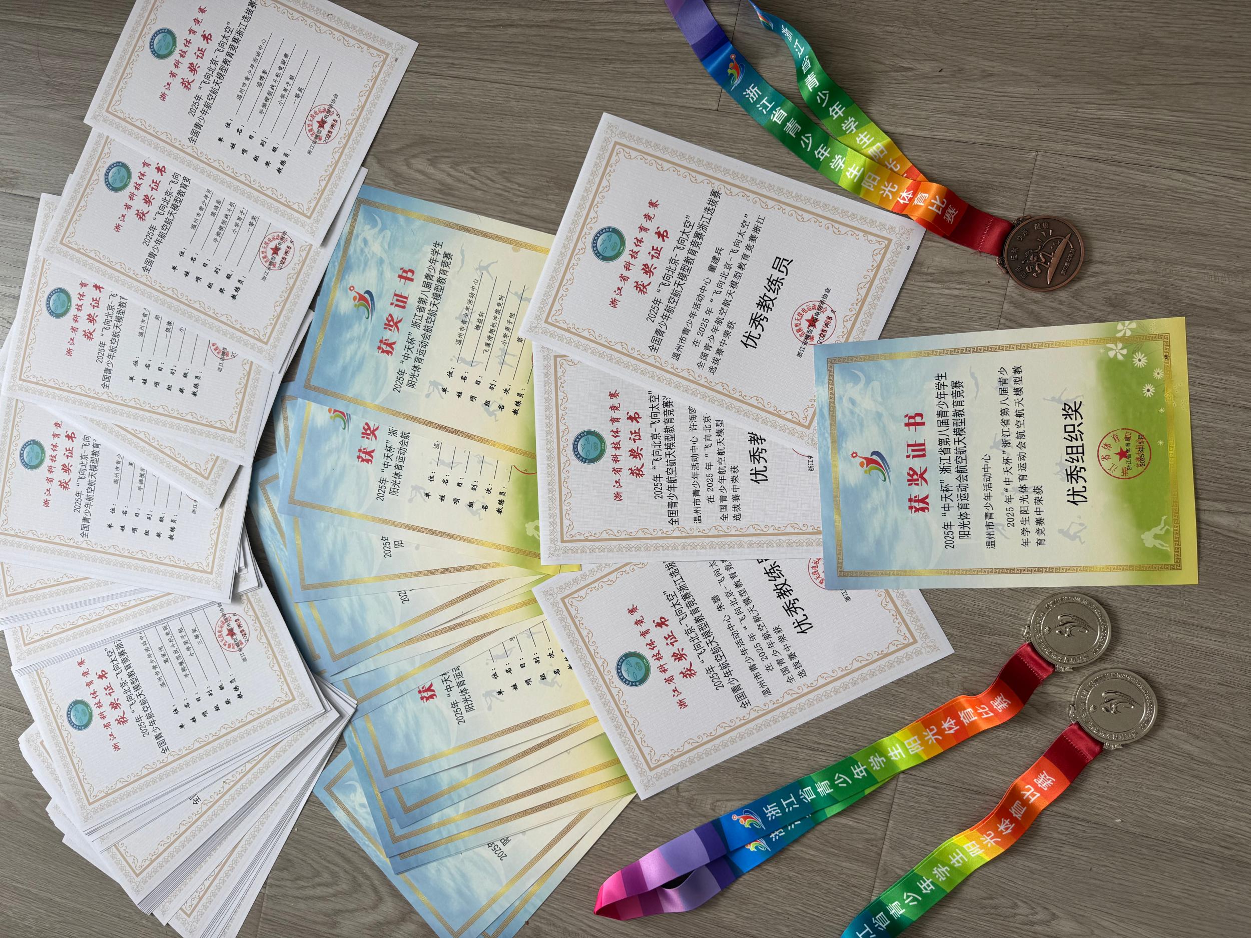 经过激烈角逐,温州市青少年活动中心代表队共斩获一等奖6人、二等奖19人、三等奖35人,代表队获得比赛的“优秀组织奖”,童建兵、朱碧、许海鸥3位老师被评为优秀教练员。其中,小学组选手梅益轩凭借“飞翼滑翔机冲浪”竞时赛,以8秒44摘得银牌,陈依娜获得“一级橡筋动力飞机”银牌,温博誉获得“手掷模型战斗机”竞距赛铜牌。