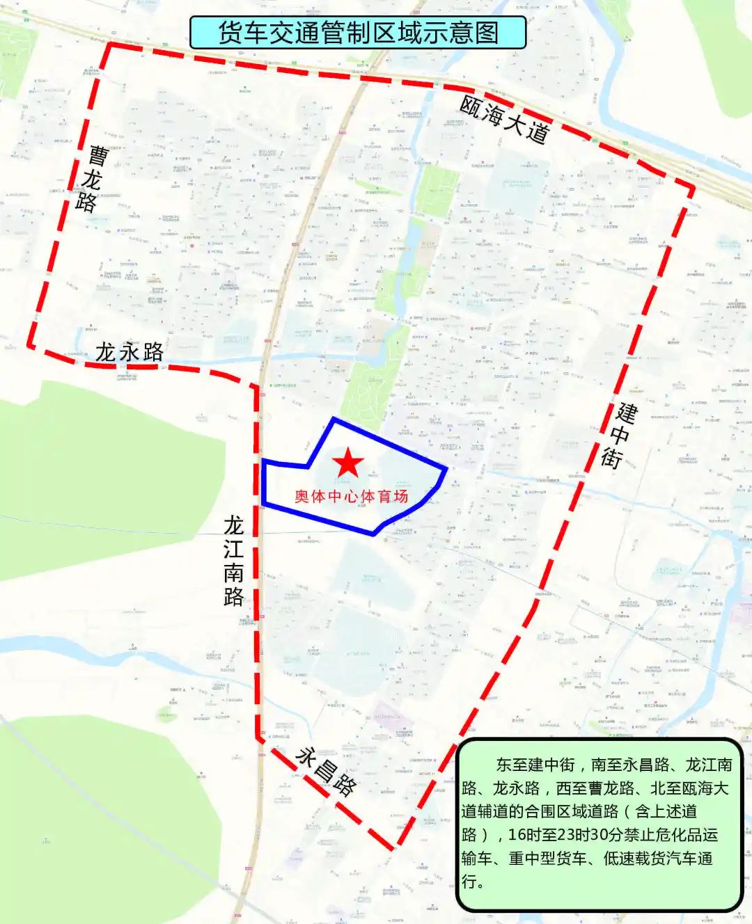 5月10日、11日,东至建中街,南至永昌路、龙江南路、龙永路,西至曹龙路、北至瓯海大道辅道的合围区域道路(含上述道路),16时至23时30分禁止危化品运输车、重中型货车、低速载货汽车通行。