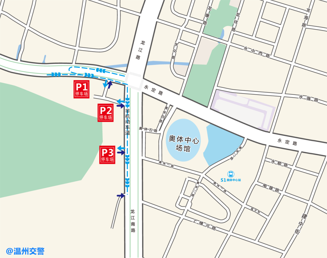 为统一规范网约车乘客上下点,确保观众有序进、离场,17时至23时,各网约车平台旗下所有网约车在龙湾奥体周边道路范围内屏蔽现有上车点,启用5个临时上车点:永中西路龙康路路口、永中西路龙祥路路口、奥体会展中心停车场P4、龙海路西侧万达公交站点、永定路万新社区服务中心公交站点。