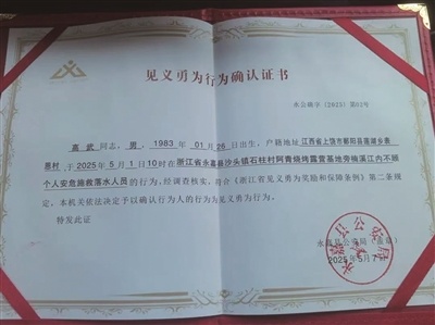 “人生英雄志,不怕牺牲身。”5月7日,高武的家属从永嘉县公安局拿到了高武的《见义勇为行为确认证书》。6天前,在温州楠溪江湍急的江水中,他将一名落水男孩高高托举起,直至自己力竭。高武,这名42岁的江西鄱阳汉子,用奋不顾身的义举,挽救了一条小生命,自己却永远留在了那儿。