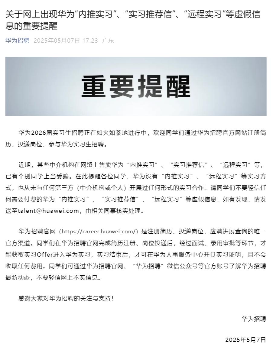 5月7日,“华为招聘”微信公众号发文提醒:近期,某些中介机构在网络上售卖华为“内推实习”“实习推荐信”“远程实习”等,已有个别同学上当受骗。