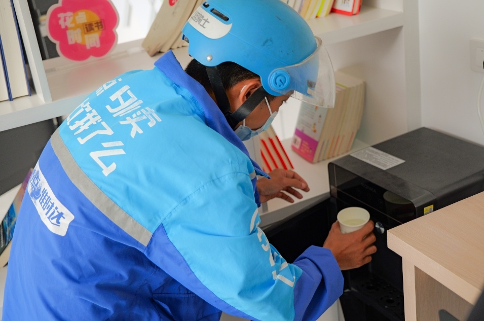 在大峃镇文峃里城市驿站,穿梭在大街小巷的骑手和快递员们陆续走进驿站,他们接过志愿者递上的温水后,有的选择斜靠在沙发上刷会手机放松自己,有的则拿起一本感兴趣的书阅读起来,电视机前也围着三三两两的人,凑在一起谈论着节目。“我们累的时候,可以进来休息一下,刷刷短视频,然后给手机充会电,下雨天没伞还可以借伞,很贴心。”外卖员王双杰表示,城市驿站对于骑手来说,是一个轻松自在的好地方。