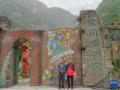 在四川省汶川县映秀镇一碗水村,刘先友(左一)和来自成都的游客在以“尖被百合”为原型的“百年好合”亭中交流(5月9日摄)。