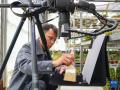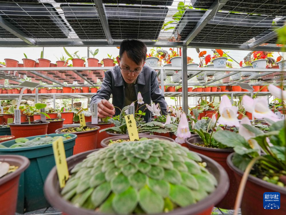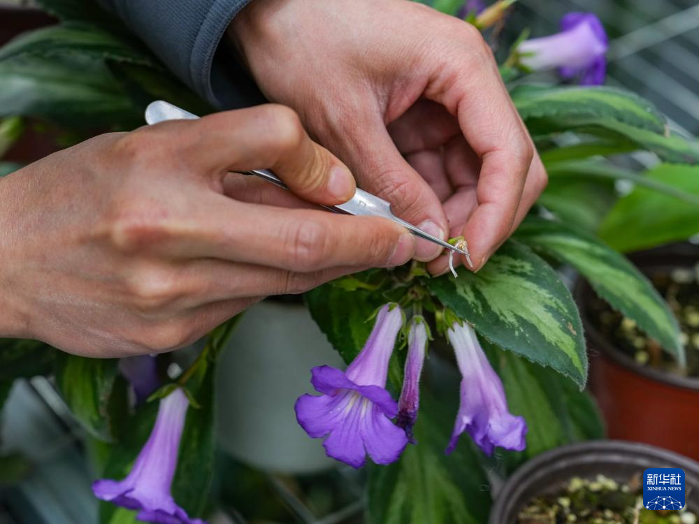 在四川省汶川县映秀镇一碗水村,刘明在植物园的保育棚给报春苣苔授粉(5月9日摄)。