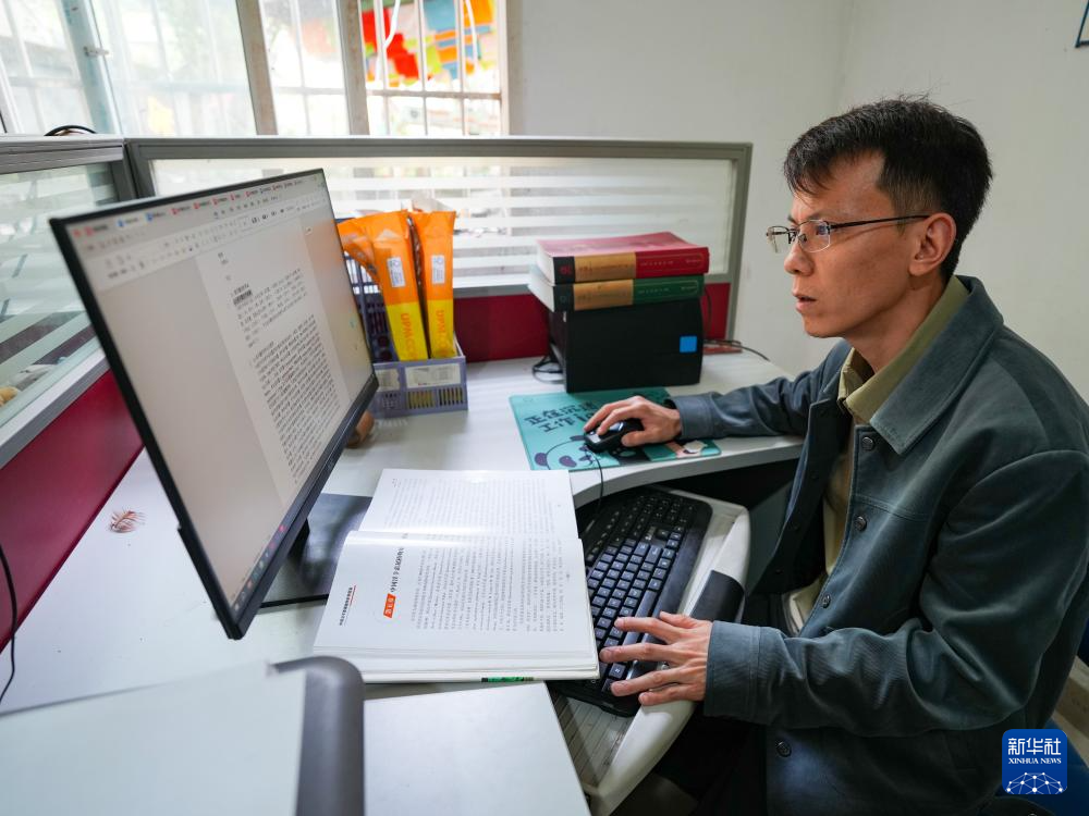 在四川省汶川县映秀镇一碗水村,刘明在办公室查阅文献资料(5月9日摄)。