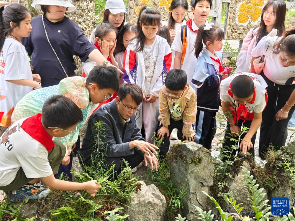 在四川省汶川县映秀镇一碗水村,刘明(前排左三)给前来研学参观的学生们讲解汶川干旱河谷常见植物(5月10日摄)。