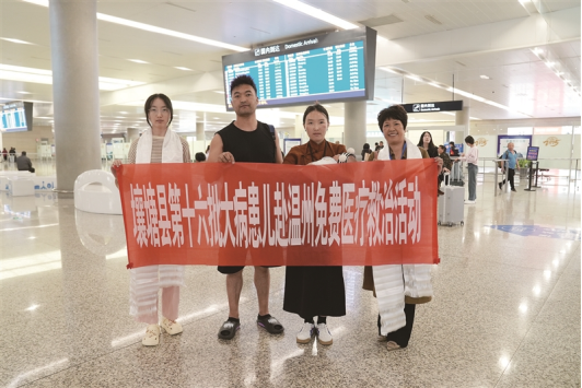 “温心守护”团队到温州龙湾国际机场迎接小岗一家。医院供图