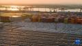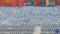 这是5月12日在江苏南京龙潭港集装箱码头拍摄的准备装船出口的汽车(无人机照片)。