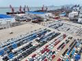 5月13日,在江苏省连云港港东方港务分公司码头,大批轿车集港准备装船出口(无人机照片)。