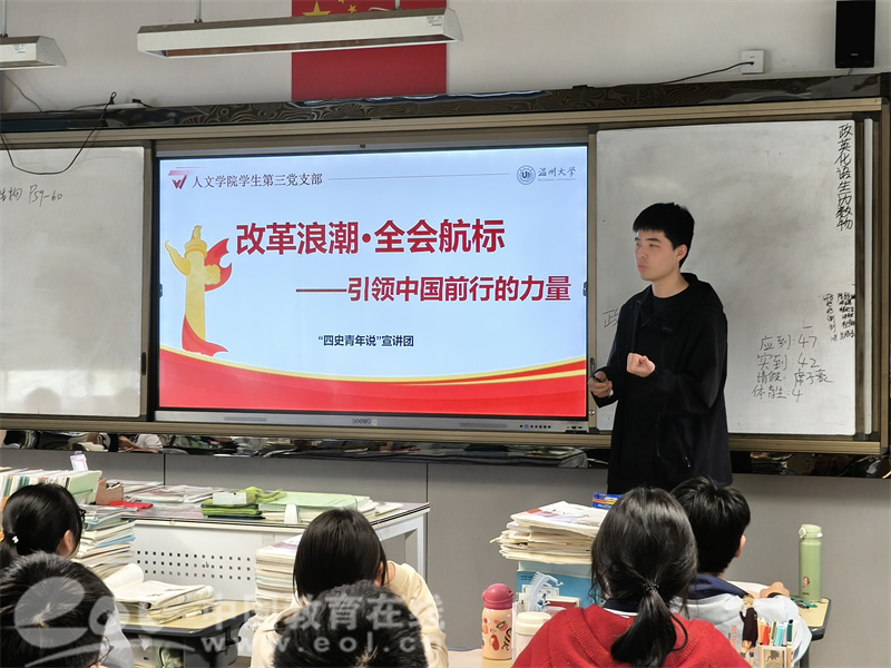 在深化新时代学校思想政治理论课改革创新的征程中,“大中小学思政课一体化”建设是提升学生政治认同、思想认同,坚定对马克思主义的信仰、对中国特色社会主义信念的重要渠道之一。温州大学人文学院学生第三党支部的党员们通过“四史青年说”宣讲活动,以青年话语传递历史之声,用青春脚步丈量时代之变,在高校与中学间架起传承红色基因的桥梁。从聆听者到讲述者,从感悟历史到践行使命,青年学子用实际行动诠释着“请党放心,强国有我”的铮铮誓言。