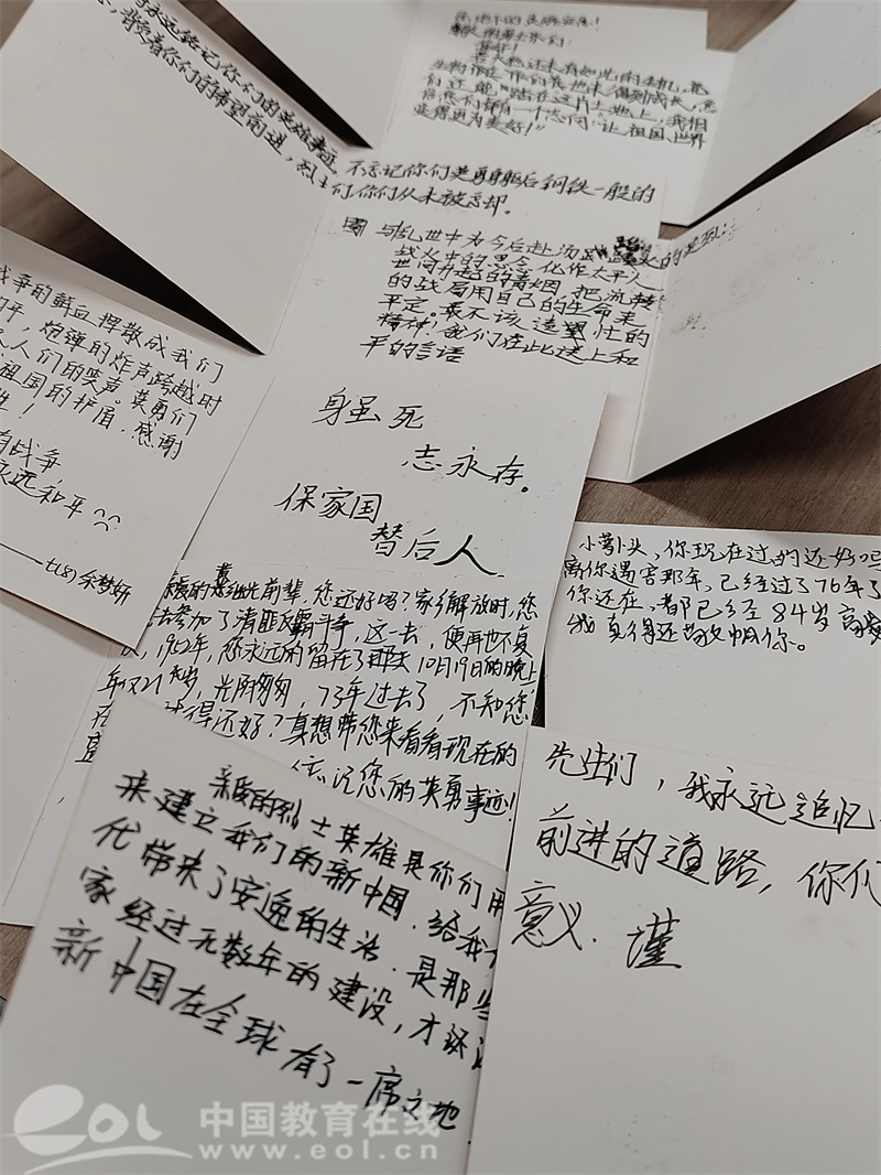 吕舒晗表示,希望通过此次宣讲,同学们能更深刻地理解清明节的意义——不仅是缅怀先人,更要铭记为国家和民族献出生命的英雄。翻开学生们写的卡片,稚嫩的笔迹诉说着坚定的信念:“你们用生命换来今日的和平,我们定不负韶华,为中华之崛起而读书!”“这个清明,我要去家乡的革命旧址看看!”在这场跨越时空的对话中,少年学子将追思化作传承火种,把誓言转化为实际行动,让红色精神在新时代绽放光芒。