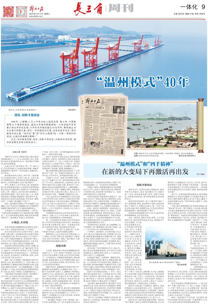 1985年5月12日,《解放日报》首次提出“温州模式”并概括了“四千精神”的内涵。40年后,《解放日报》再次整版聚焦温州,刊发题为《“温州模式”40年》的文章,以下是全文内容: