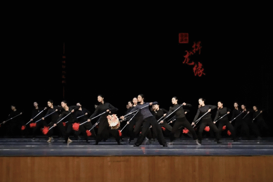 《拼龙缘》以龙湾首位女性“龙把头”与海外闯荡的师兄间的情感羁绊为主线,通过“学艺”“离乡”“归巢”等场景,展现非遗的代际传承与华侨群体的故土情结。女主角打破传统成为首位女龙头的故事,呼应了温州人“敢为天下先”的胆识;而师兄海外漂泊闯荡的经历则折射出温州侨胞的奋斗历程。全剧高潮时,龙身拼出的“合”“美”二字,既是对家国团圆的期许,也隐喻着传统与现代文明的共生。为破解“拼字”动态视觉化的难题,创作团队将现代舞编创理念融入传统肢体语言,结合矩阵式队形变换与光影技术,使龙灯在舞台上灵动变幻,既保留“万人空巷闹龙灯”的乡土气息,又赋予其现代表演美学。