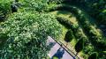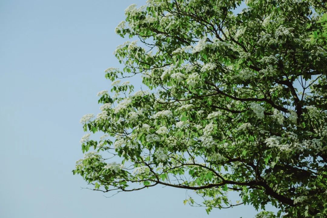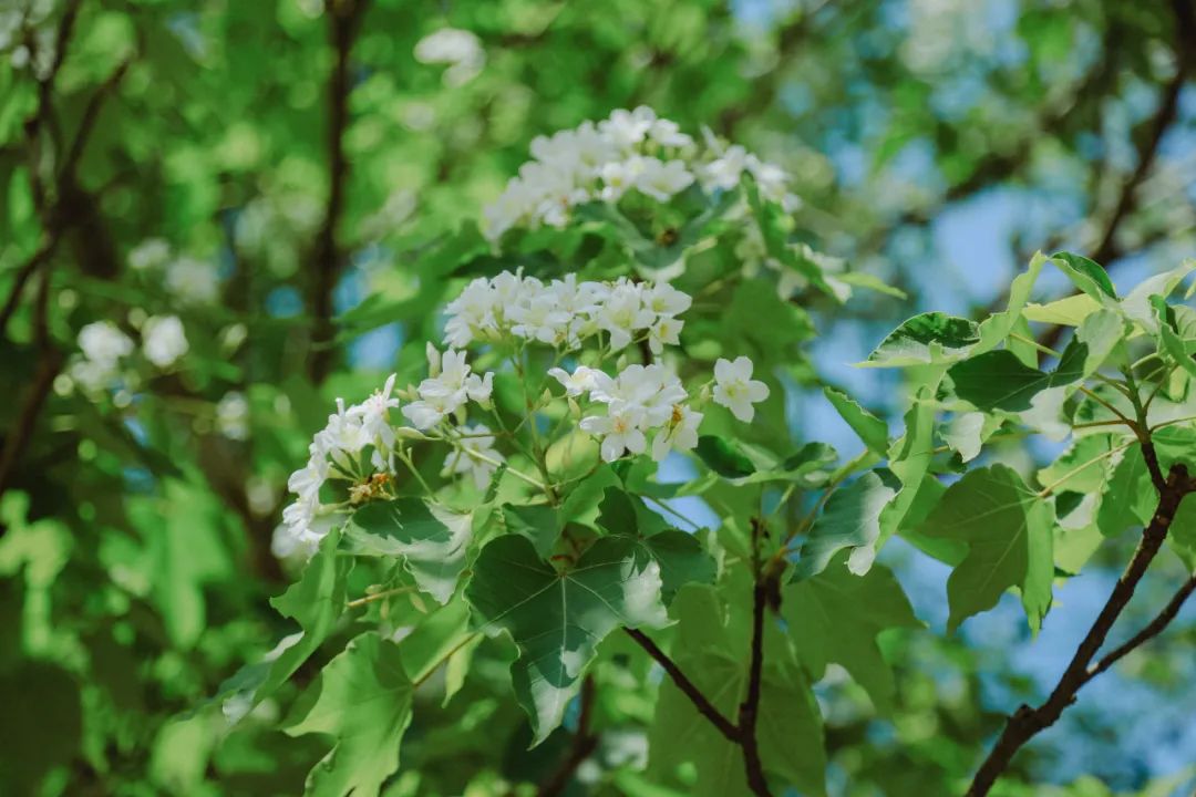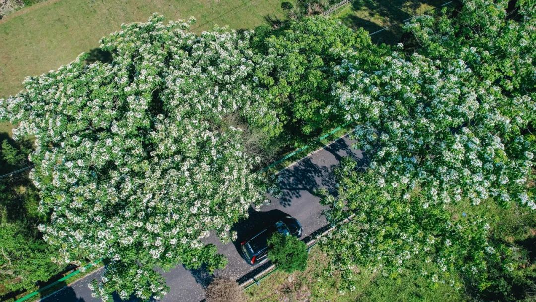 绿道中,油桐树高大挺拔,繁茂的枝叶间,油桐花一团团、一簇簇地挂满枝头。
