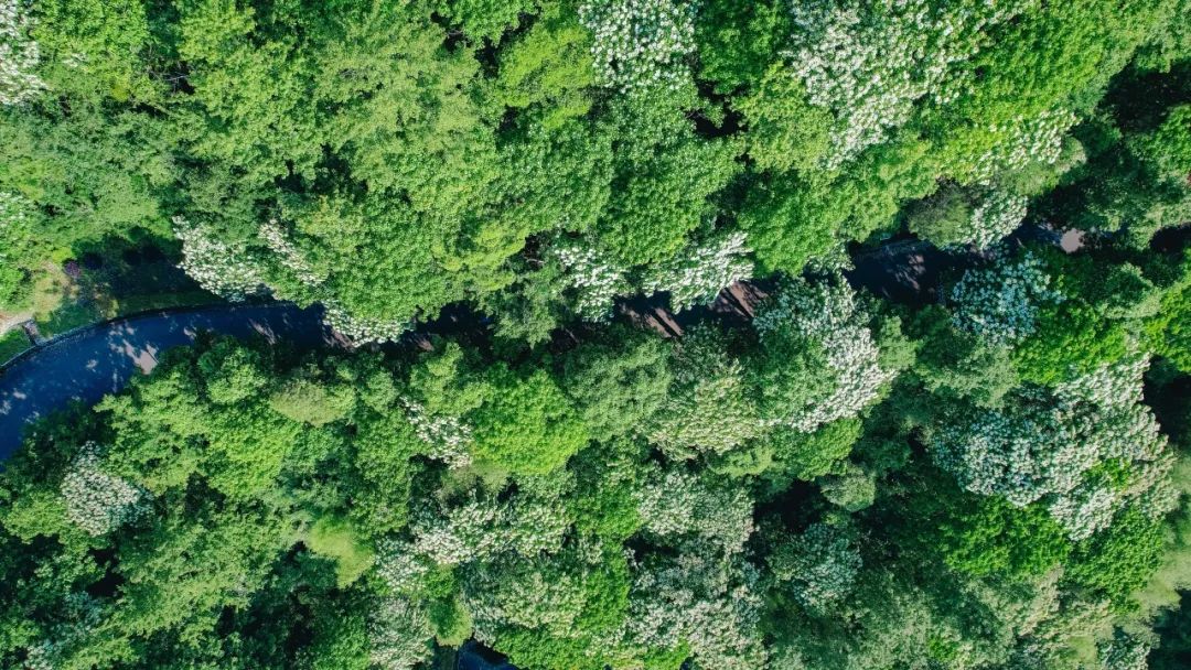 光影透过枝叶的缝隙,在绿道中、山林间,形成一片片斑驳的花影。
