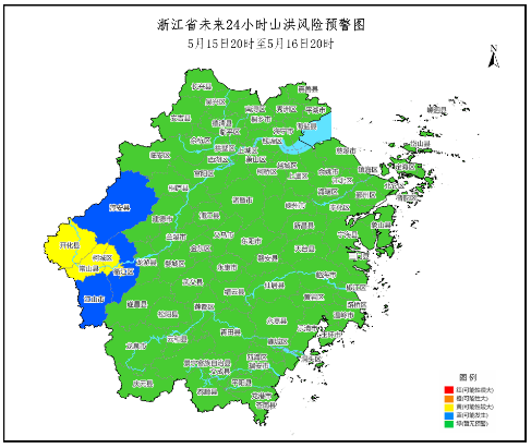 浙江省水利厅、省气象局5月15日17时19分联合发布山洪灾害预警:根据省气象台未来降雨预报,预计5月15日20时至5月16日20时,柯城区、常山县、开化县发生山洪灾害可能性较大(黄色预警),淳安县、衢江区、江山市可能发生山洪灾害(蓝色预警)。