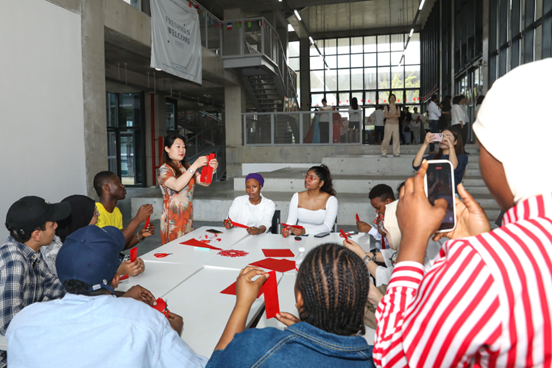 现场还设置了互动体验区,艺术家们手把手指导国际学生创作简单剪纸作品,20余国来华留学生们在“指尖翻飞”中感受非遗文化的生命力,在方寸红纸间感受中华传统美学。学生们在艺术家指导下创作出“喜”“福”“财神”等主题剪纸作品,将文化认知转化为指尖实践。