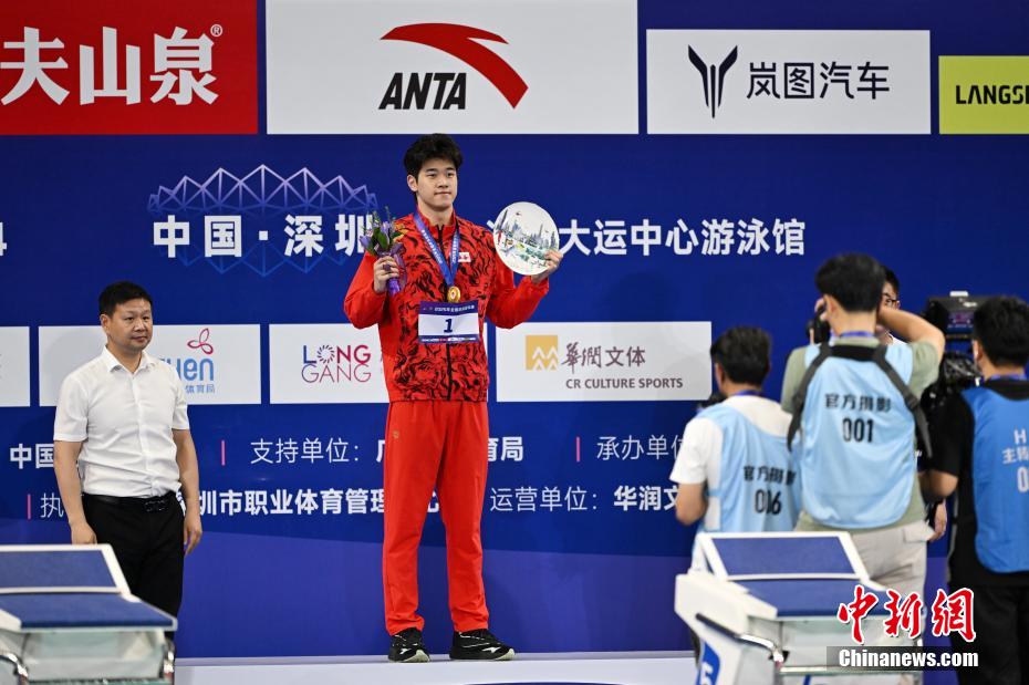 5月17日晚,2025年全国游泳冠军赛男子400米自由泳决赛在广东深圳大运中心游泳馆举行,浙江寿仙谷队选手潘展乐以3分45秒34的成绩夺得金牌。图为潘展乐参加颁奖仪式。