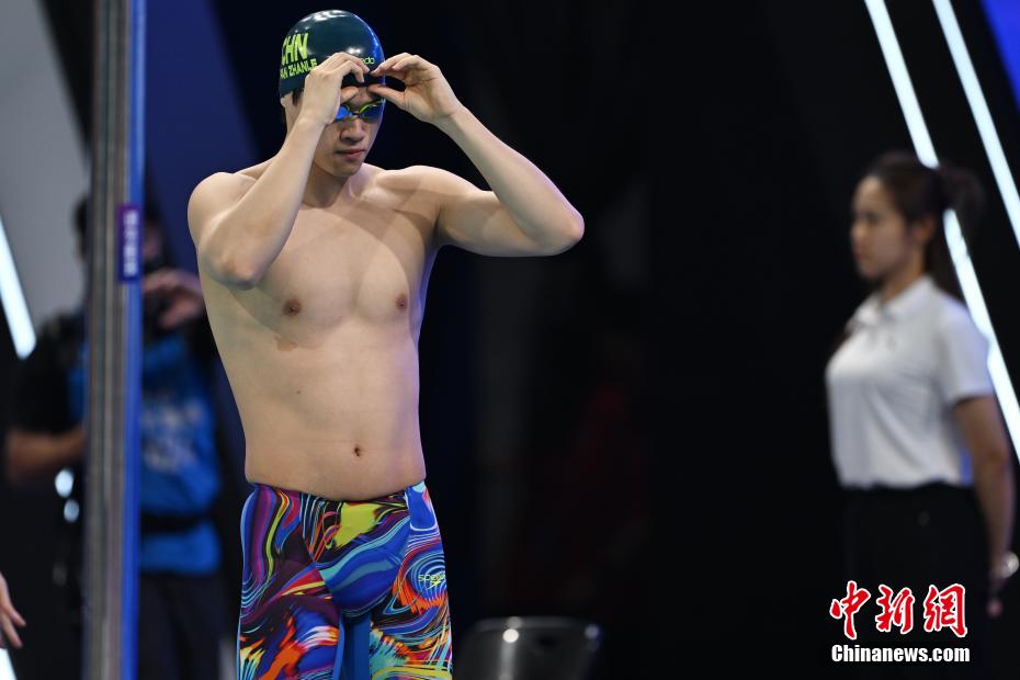 5月17日晚,2025年全国游泳冠军赛男子400米自由泳决赛在广东深圳大运中心游泳馆举行,浙江寿仙谷队选手潘展乐以3分45秒34的成绩夺得金牌。图为潘展乐在比赛前调整泳帽。中新社记者 陈楚红 摄