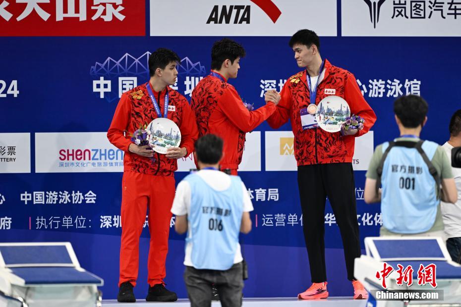 5月17日晚,2025年全国游泳冠军赛男子400米自由泳决赛在广东深圳大运中心游泳馆举行,浙江寿仙谷队选手潘展乐以3分45秒34的成绩夺得金牌。图为颁奖仪式上,金牌获得者潘展乐(中)和铜牌获得者孙杨握手。