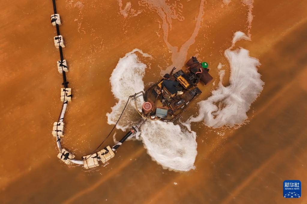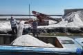 5月18日,河北唐山南堡盐场的工人将收获的春盐装船(无人机照片)。
