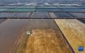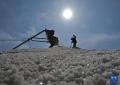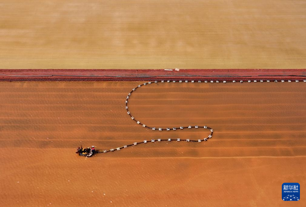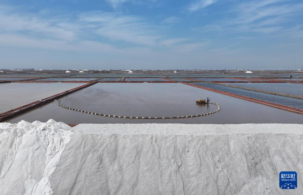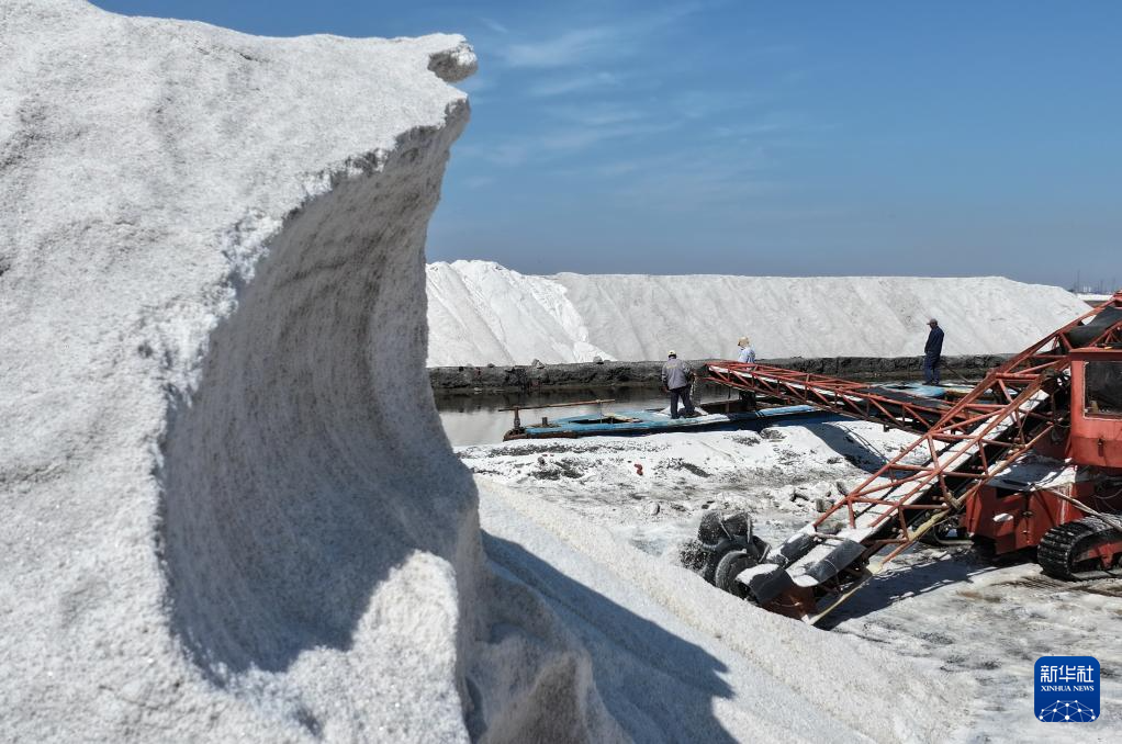 近日,河北省唐山市曹妃甸区南堡盐场的35万亩盐田迎来春盐收获期,工人利用晴好天气加紧收获,盐田里处处繁忙景象。