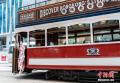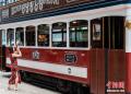图为身着旗袍的女士在复古电车旁拍照。