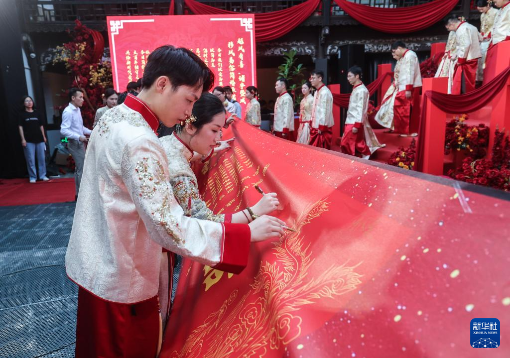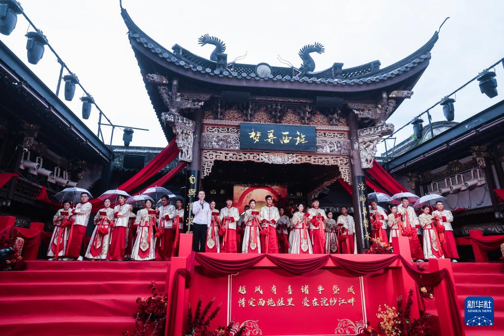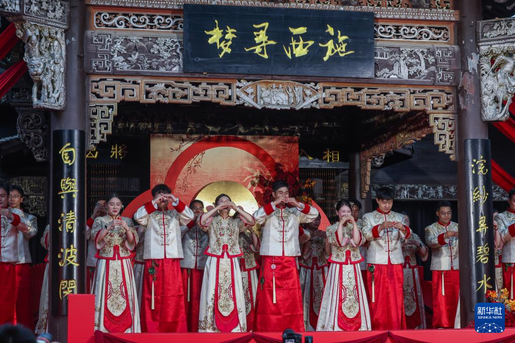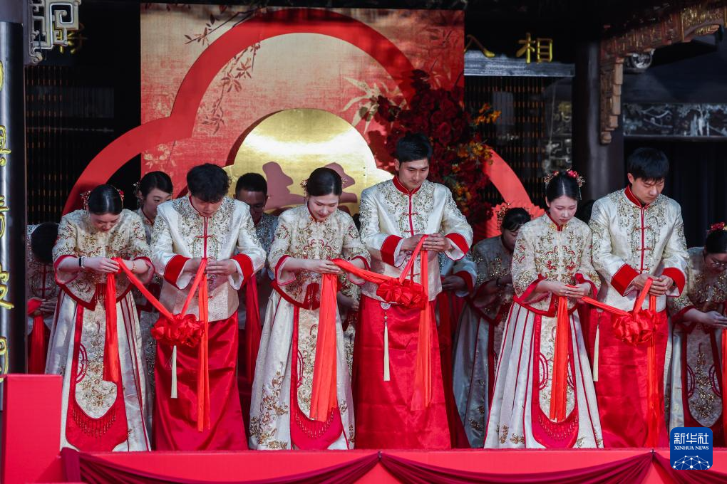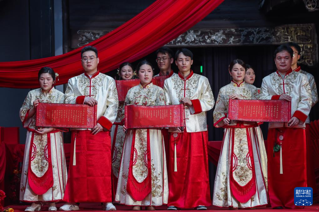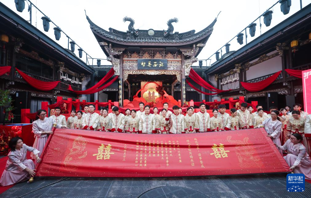 5月20日,参加集体婚礼仪式的新人们合影。当日,18对新人在浙江省诸暨市西施故里景区内参加以“越风有喜·诸事暨成——情定西施故里 爱在浣纱江畔”为主题的集体婚礼。本次集体婚礼旨在倡导文明简约的婚嫁理念,通过精心设计的集体婚礼仪式,为新人打造既庄重又温馨的婚礼体验,既减轻经济负担、又传承美好家风,倡导婚俗改革文明新风尚。新华社记者 徐昱 摄