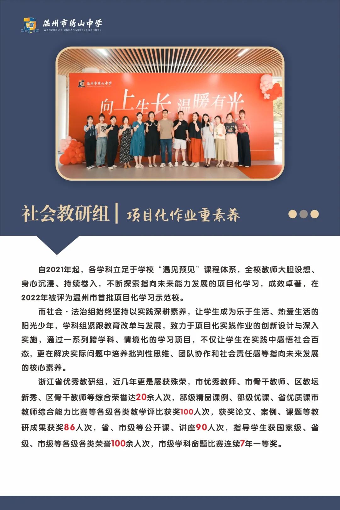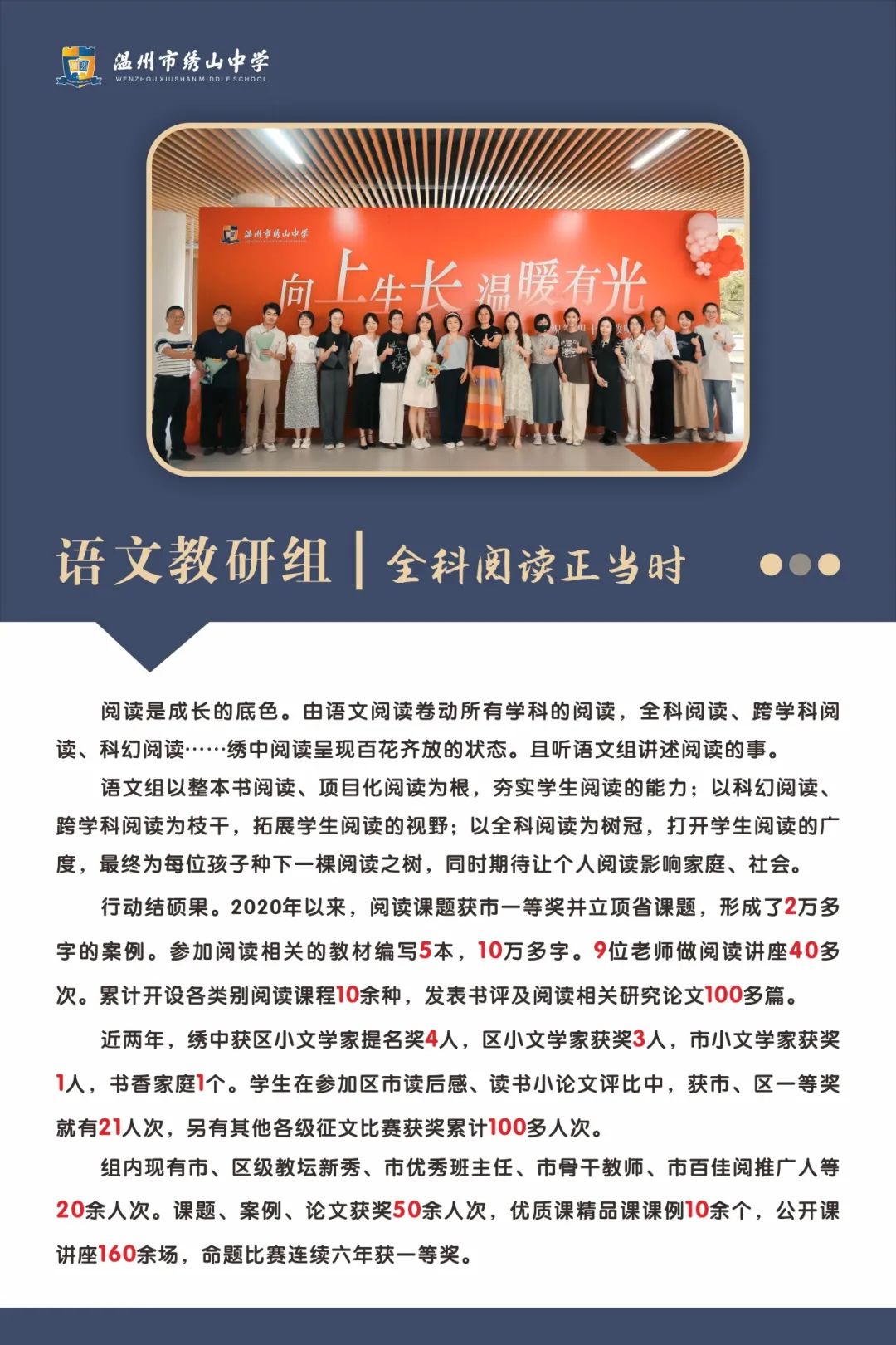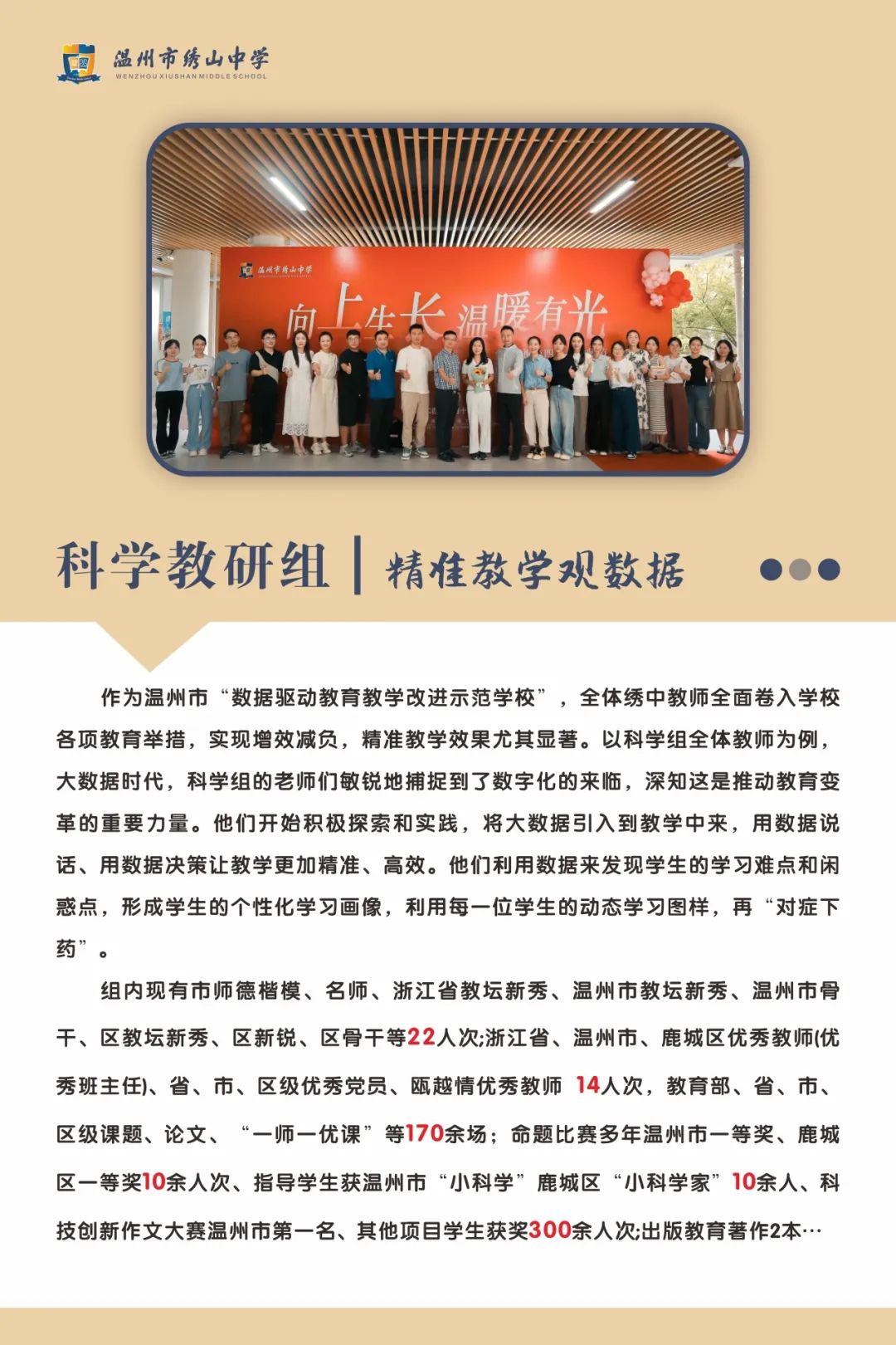 各学科组协同共进,在精准教学、项目化学习、一生一策、全科阅读等领域深耕,为教育教学高质量发展提供坚实支撑。其中,数学组、社会组、体育组获浙江省先进教研组;英语组获浙江省巾帼文明岗;音乐组获温州市先进教研组。