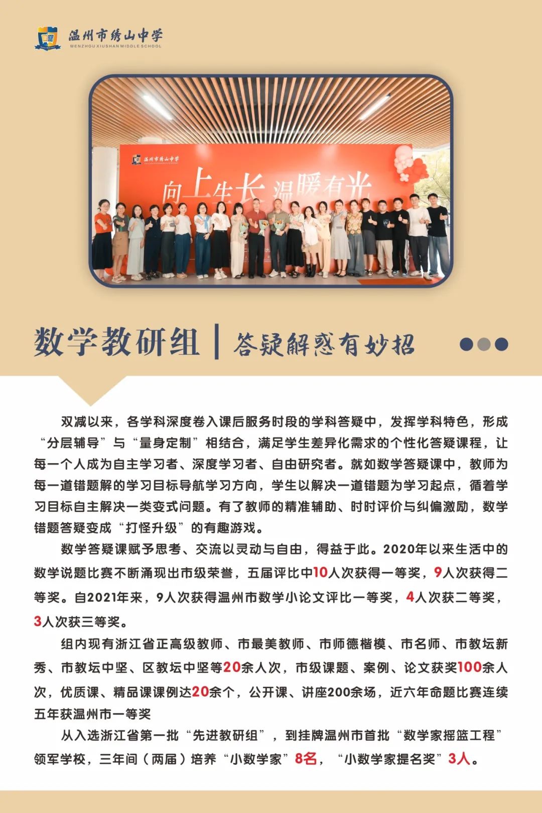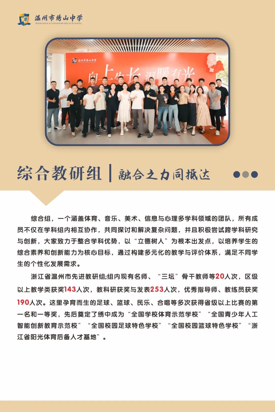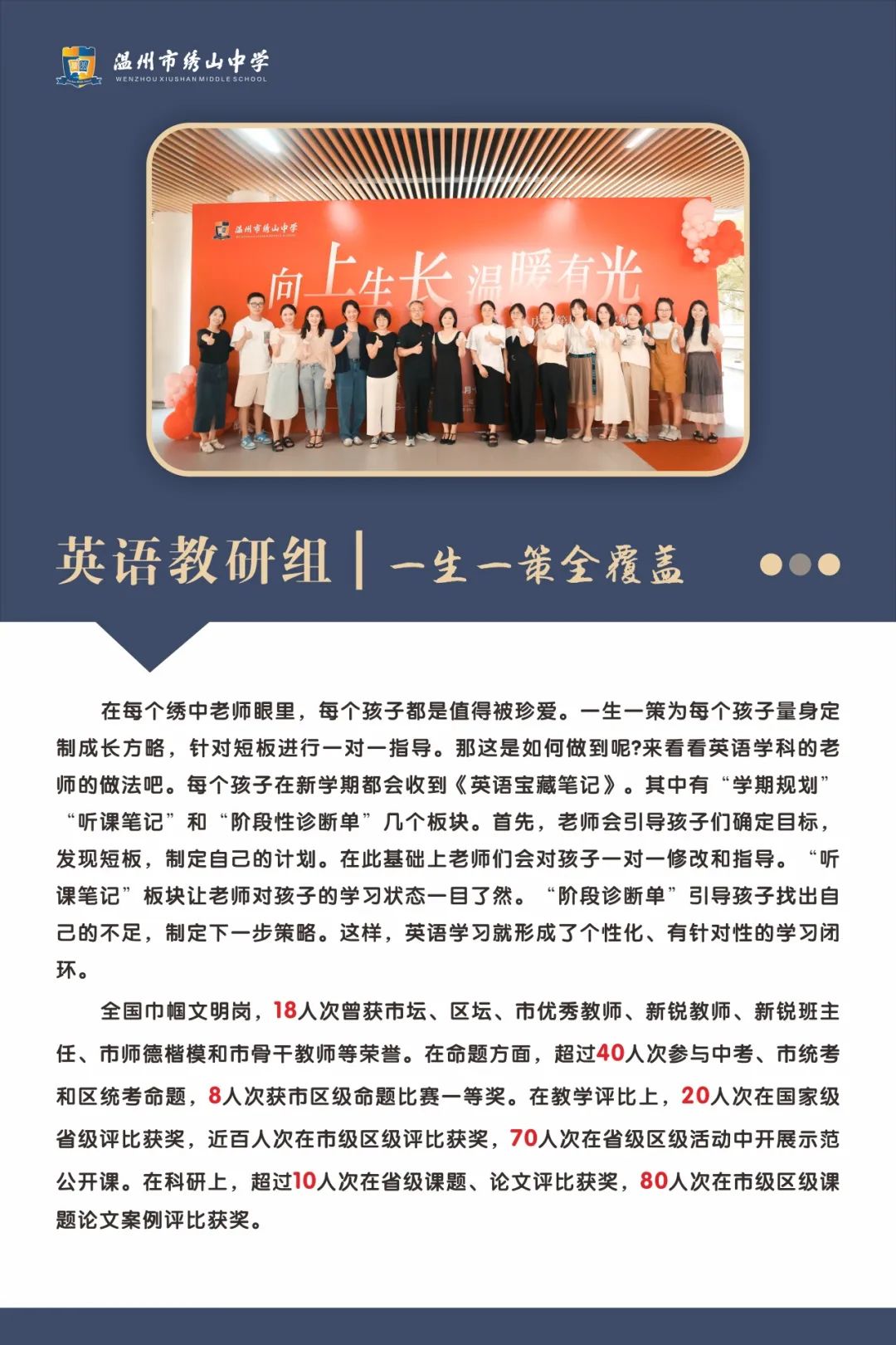 各学科组协同共进,在精准教学、项目化学习、一生一策、全科阅读等领域深耕,为教育教学高质量发展提供坚实支撑。其中,数学组、社会组、体育组获浙江省先进教研组;英语组获浙江省巾帼文明岗;音乐组获温州市先进教研组。