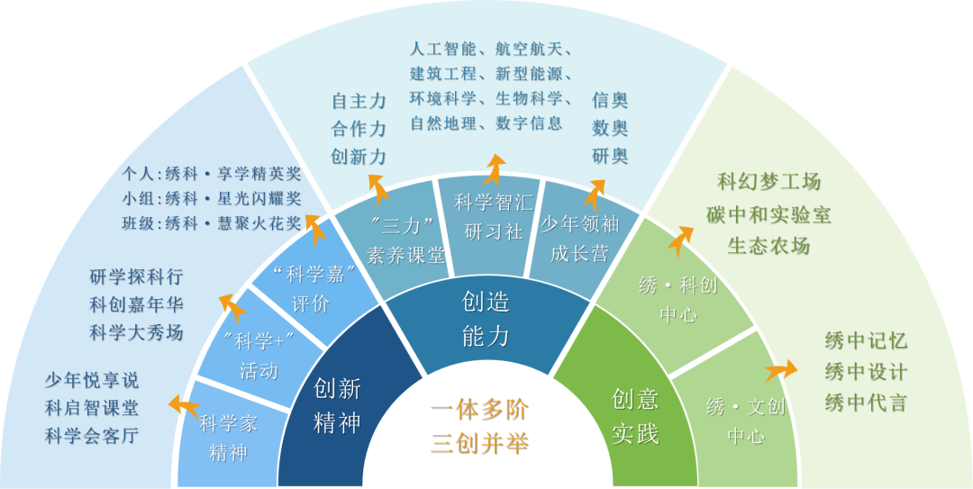 “三创”课程,是学校举办温州市科技中学以来,依据“一体多阶”的培养模式,探索从小学到中学、从普适到拔尖的进阶式培养序列。在此框架内,学校以创新精神为引领、创造能力为核心、创意实践为载体,形成“三创”协同并进的教育格局。