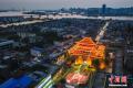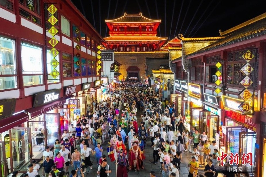 5月20日晚,湖北襄阳举行古城建城日活动。该活动首次采用无主屏实景演绎,让观众沉浸式感受襄阳古城千年风华。襄阳古城有“华夏第一城池”之称,始建于汉代,彼时为夯土所砌,宋朝开始使用城砖。该市近年来紧紧围绕古城保护与利用,统筹协调文物保护与经济社会发展。图为古城建城日活动当天,襄阳北街游人如织。(无人机照片)张倩龙 摄