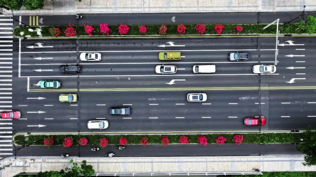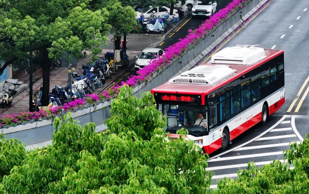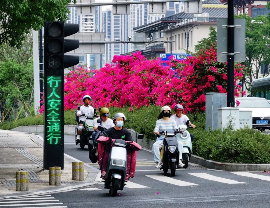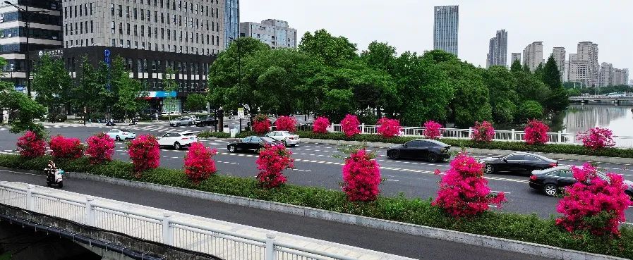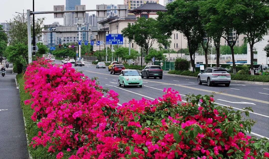 在惠民路绿化带中,三角梅被驯化成一根根能量柱,整齐列队,守护车流。