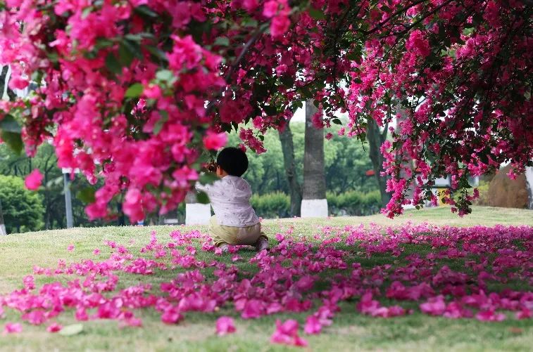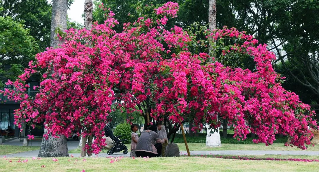 翠绿的草坪上,三角梅开出火红的巨型花蘑菇,钻进高2.5米,冠幅3.5米的花树下,做个安静的拇指姑娘。