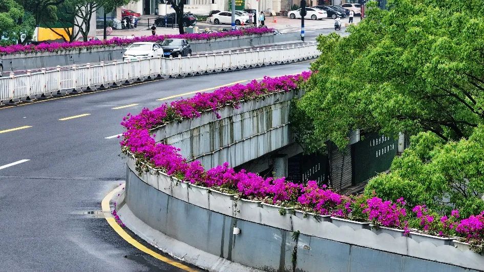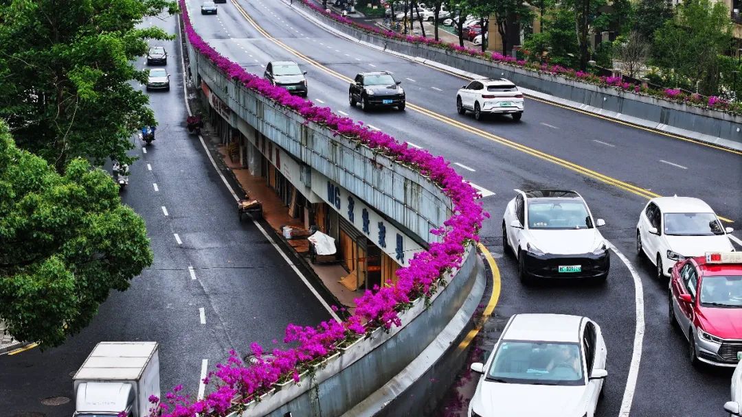黎明立交桥花箱中的三角梅盛放,4条道路像玫红钢铁动脉向各个方向延伸。阳光下,车影流光与花影交错。