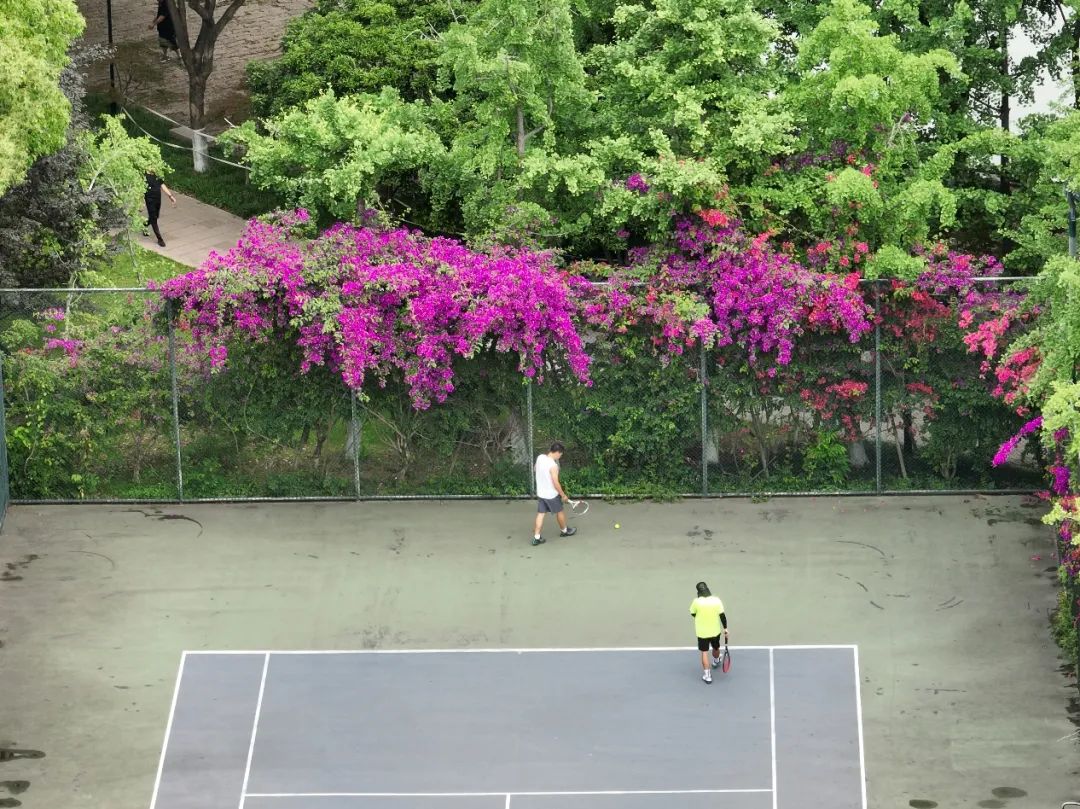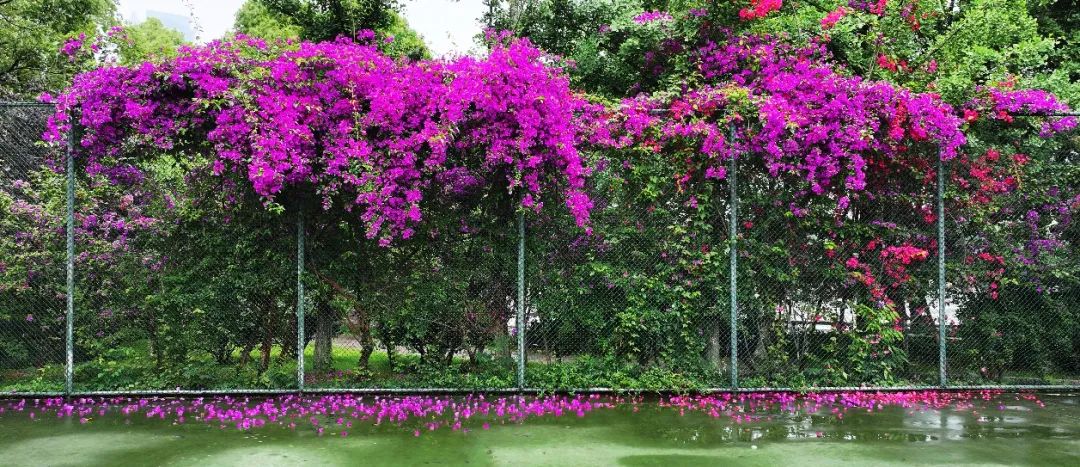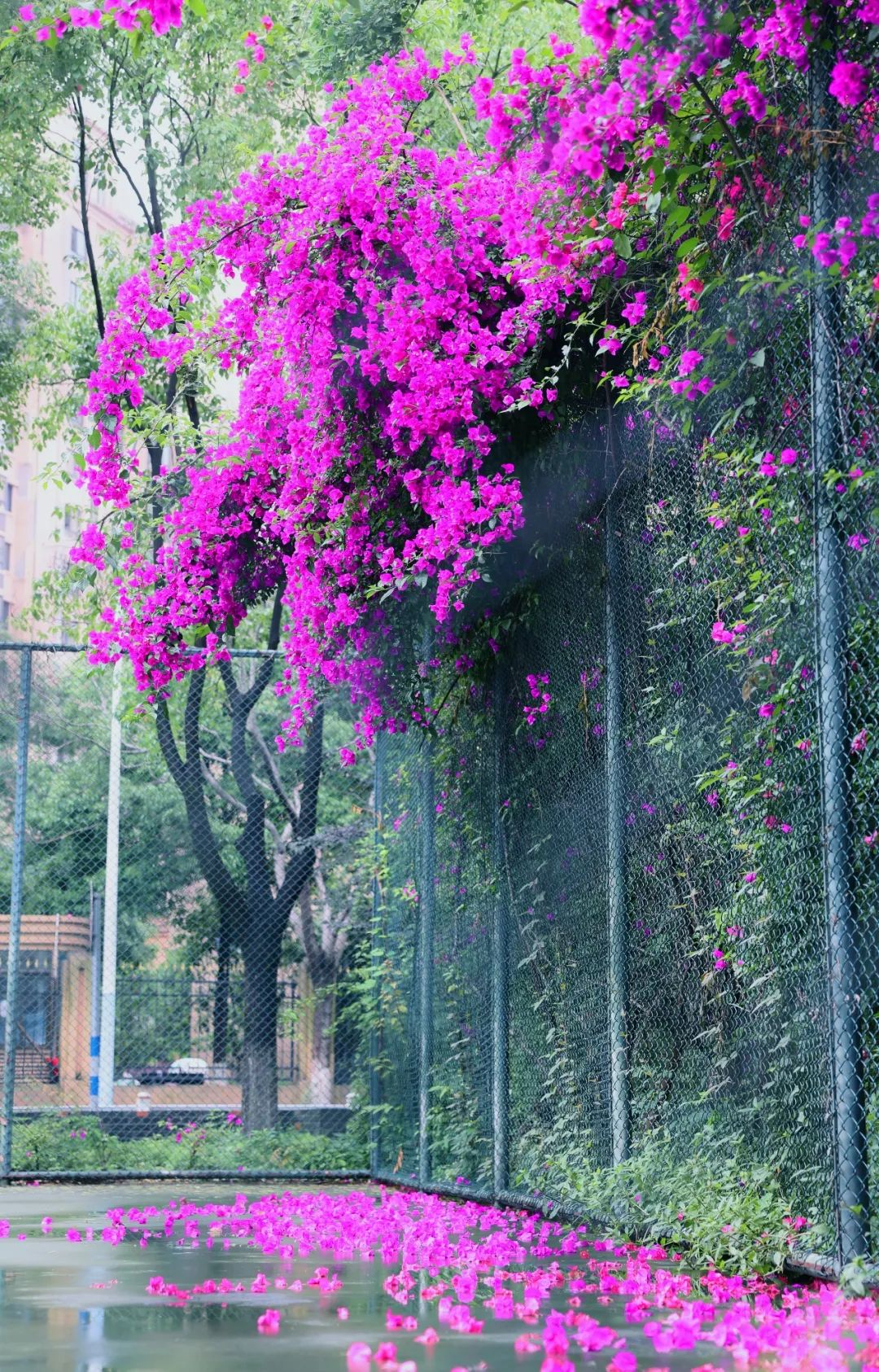 三角梅在公园网球场的护栏上铺陈出长12米,垂挂近2米的“锦缎”,网状的铁丝护栏将这面“缎子”撕成“玫红蕾丝”。