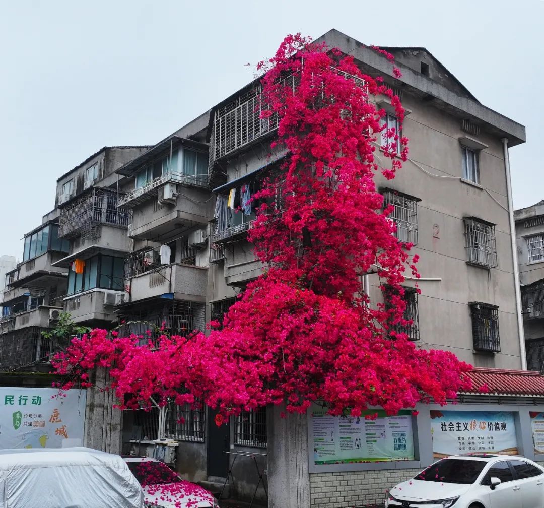 三角梅在老旧小区的空调外机和晾衣杆间杀出血路,爬满了整面墙壁,吞没整栋楼!老头背心+拖鞋的居民从花下走过,这市井烟火混搭花景,宁静温馨。