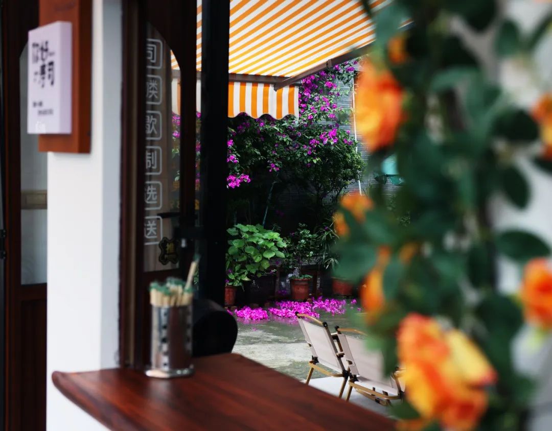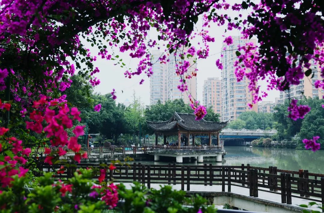 沿南塘河,三角梅花瀑直接怼进河里,与栈道和亭廊相融,像闯进水墨画中。