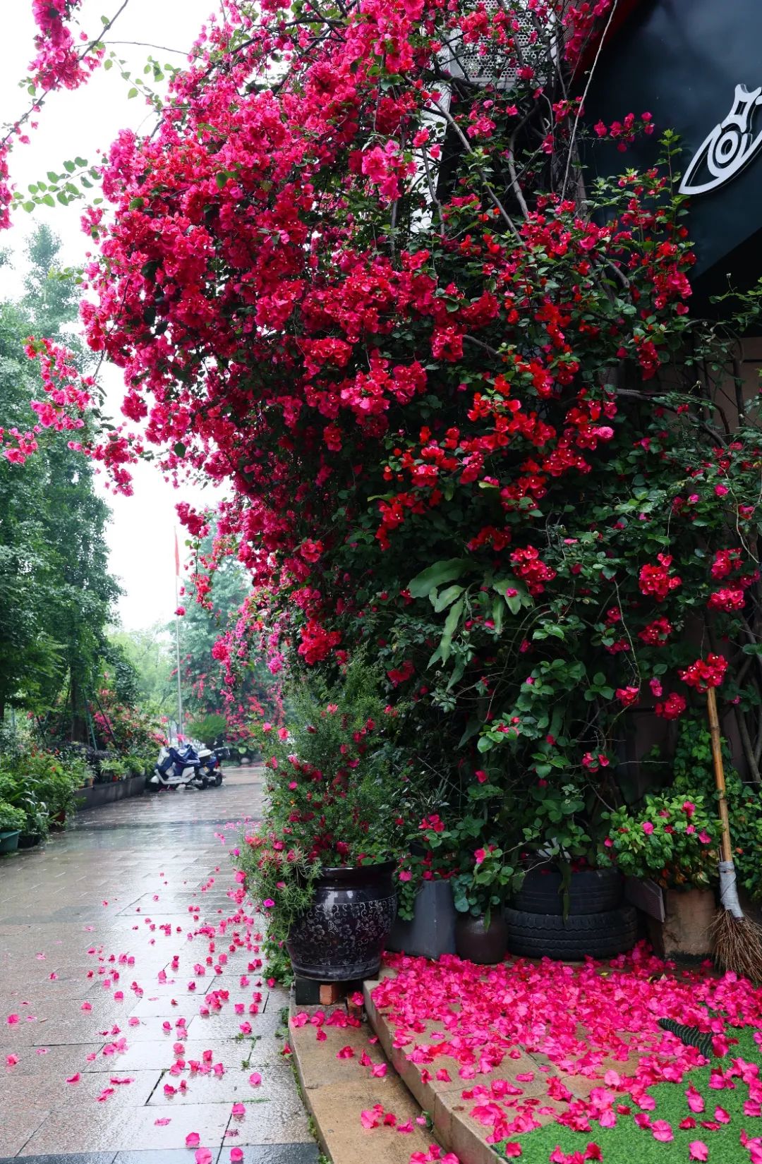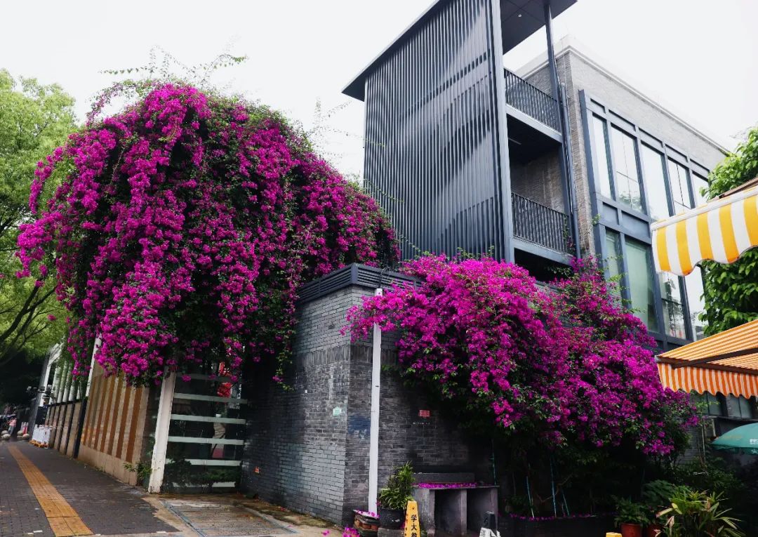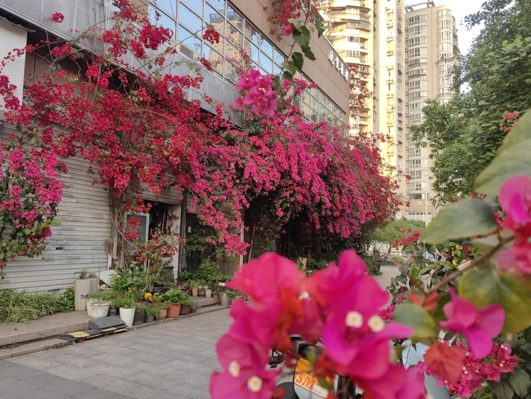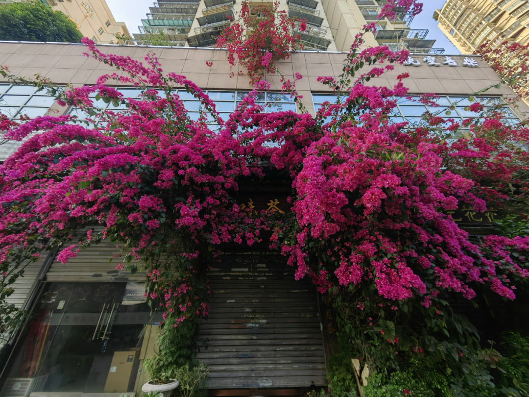 每到五月,锦桂大厦这间门面房前的三角梅,总是开出城市的网红点,四处攀延的三角梅,把店面啃成10多米长粉色虫洞!进出店铺就像在花洞中穿梭。