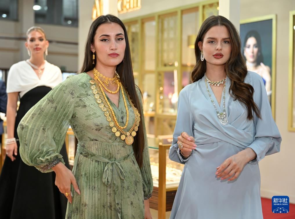 5月21日,模特在科威特哈瓦利省第23届国际黄金珠宝展上展示珠宝首饰。
